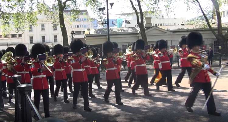 At the same time the detachment of soldiers that are ending their shift at St James’s Palace will assemble in Friary Court, to the rear of the Palace. Since they are about to march to Buckingham Palace, this makes a good place to begin your visit to the Changing The Guard ceremony.