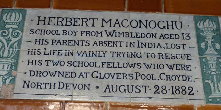 His plaque, which was in fact added to the memorial in 1931 - making it the last plaque to go up on the wall until the memorial to Leigh Pitt was added in 2009 - gives the following details of his brave act of heroic self-sacrifice, "Herbert Maconoghu, School Boy From Wimbledon, Aged 13. His Parents Absent In India, Lost His Life In Vainly Trying To Rescue His Two School Fellows, Who Were Drowned At Glovers Pool, Croyde, North Devon, August 28 1882."