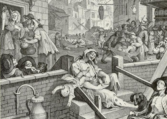 This wave of drunkenness was, famously, satirized by William Hogarth in his engraving entitled "Gin Lane."