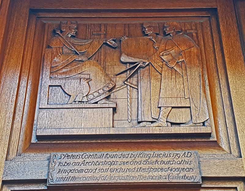 "St Peter's Cornhill founded by King Lucius 179 A. D. to be an Archbishop's see and chief church of his kingdom and so it endured the space of 400 years until the coming of Augustine the monk of Canterbury."